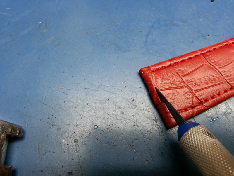 Второй шаг - с помощью скальпеля отметьте боковые выемки, наметьте то, что будете резать. Отрежьте стороны выемки в первую очередь. Чтобы отрезать конец, прорежьте половину кожи, начиная с одного угла, затем повторите с другим углом. Переверните ремешок и повторите с нижней стороны.