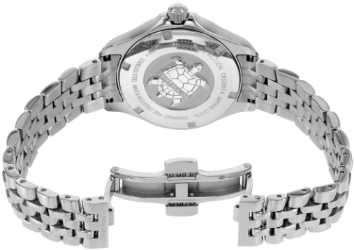 Модель DS Action Lady – не просто красивый аксессуар. Ее кварцевый калибр Precidrive получил официальный сертификат хронометра престижного института тестирования COSC. Кроме того, эти часы обладают водонепроницаемостью до 20 бар. Не стоит их недооценивать: изысканный внешний вид – это не единственное достоинство данных часов. Для корпуса, браслетов и застежек своих часов марка Certina использует нержавеющую сталь 316L, отличающуюся повышенной износостойкостью, устойчивостью к коррозии и гигиеничностью. В стали содержится совсем небольшое количество никеля, поэтому этот материал не вызывает аллергии при носке. Сапфировое стекло состоит из порошка оксида алюминия (Al2O3), раскаленного до 2.000 C. Получаемые в результате сапфировые пласты нарезаются на тонкие пластины, им придают требуемую форму и полируют. Сапфир абсолютно прозрачен, обладает высокой устойчивостью к царапинам и механическим повреждениям. По этим причинам сапфировое стекло стало неотъемлемой деталью концепции DS и используется во всех моделях Certina для защиты циферблата. Вес 96 гр. Водонепроницаемость 20 бар (200 м). Диаметр корпуса 33.8 мм. Толщина 9.13 мм. Между креплениями 15 мм. Кварцевый механизм F06.411 ETA с функциями PrecidriveTM, индикатором окончания срока службы элемента питания и хронометром. PrecidriveTM - название инновационной технологии, обеспечивающей исключительную точность хода изделий Certina: Точность часов с кварцевым калибром Precidrive может сравниться с хронометрами. Часы Precidrive с погрешностью до +/-10 секунд в год в 8–10 раз точнее обычных кварцевых часов. Некоторые кварцевые часы Certina – как, например, все модели Precidrive, будь то вариант с тремя стрелками или хронограф – имеют указатель окончания срока службы элемента питания (EOL). Эта функция позволяет узнать, когда завершится срок службы элемента питания: В этом случае секундная стрелка движется с интервалами в 4 секунды, и элемент питания необходимо заменить в течение двух недель. Хронометрами имеют право называться только те часы, которые прошли сложные проверки независимой комиссии и получили сертификат точности. Организация «Contrôle officiel suisse des chronomètres», коротко «COSC», это официальная швейцарская комиссия, сертифицирующая как механические калибры, так и кварцевые часы. Считается, что король всех драгоценных камней, бриллиант, является самым тведым природным материалом в мире. Качество бриллиантов определяется по «четырем C»: Cut (огранка): Чем больше граней, тем интенсивнее камень отражает свет. Certina использует бриллиантовую огранку, полную - для бриллиантов на корпусах часов, и простую - для бриллиантов на циферблате. Colour (цвет): На первый взгляд кажется, что все бриллианты белые. Однако, эксперты различают тонкие оттенки цвета. Certina использует только бриллианты цвета Top Wesselton. Clarity (прозрачность): Почти все бриллианты имеют небольшие включения, которые можно увидеть через ювелирную лупу. Certina использует камни высокого класса прозрачности - VSI. Carat (карат): Единица веса бриллианта. Один карат равен 0,2 г. Certina использует только бриллианты, отвечающие требованиям Кимберлийского процесса - международной системы сертификации необработанных алмазов. Система призвана остановить торговлю контрабандными алмазами – так называемыми «кровавыми бриллиантами».