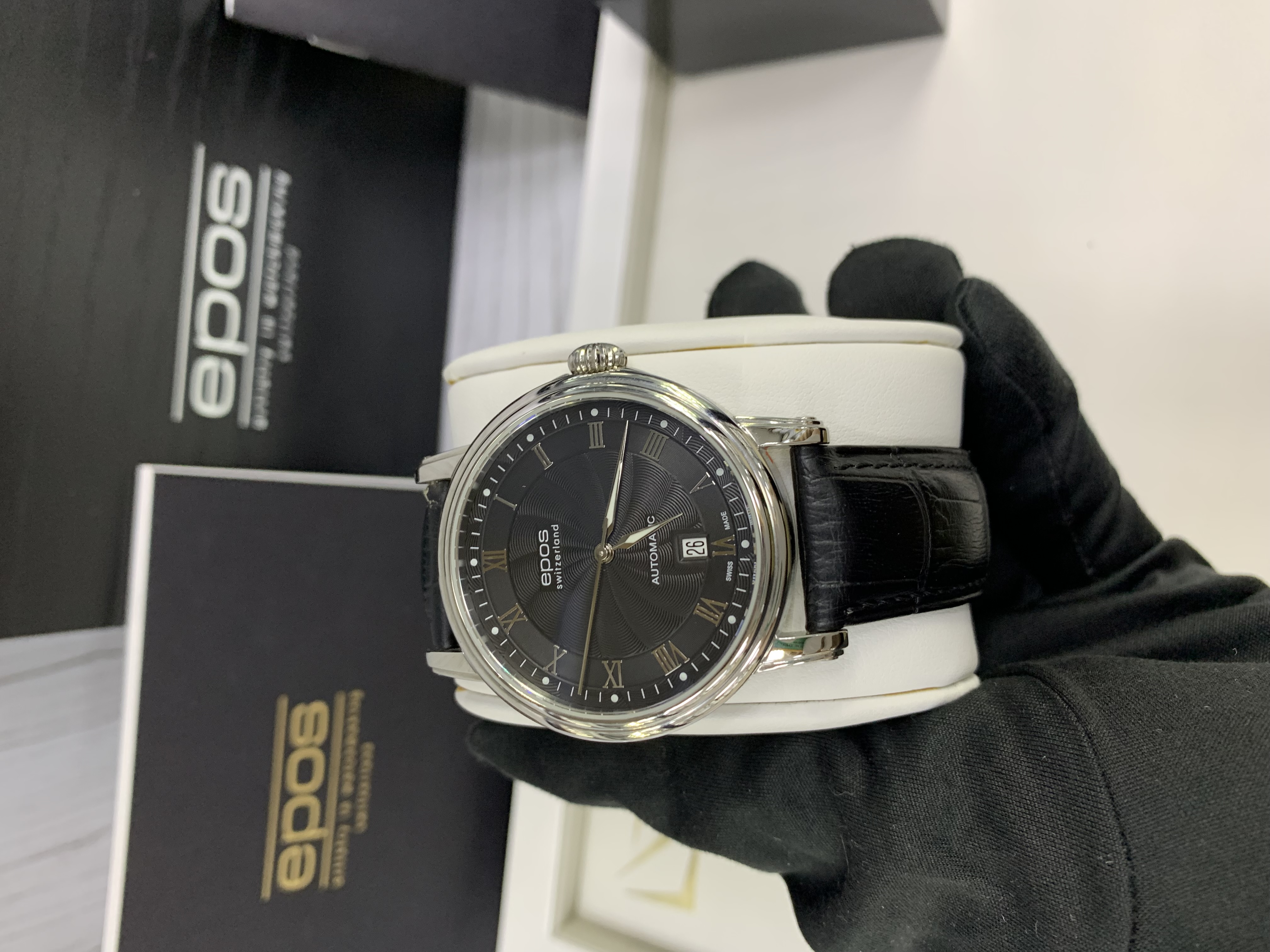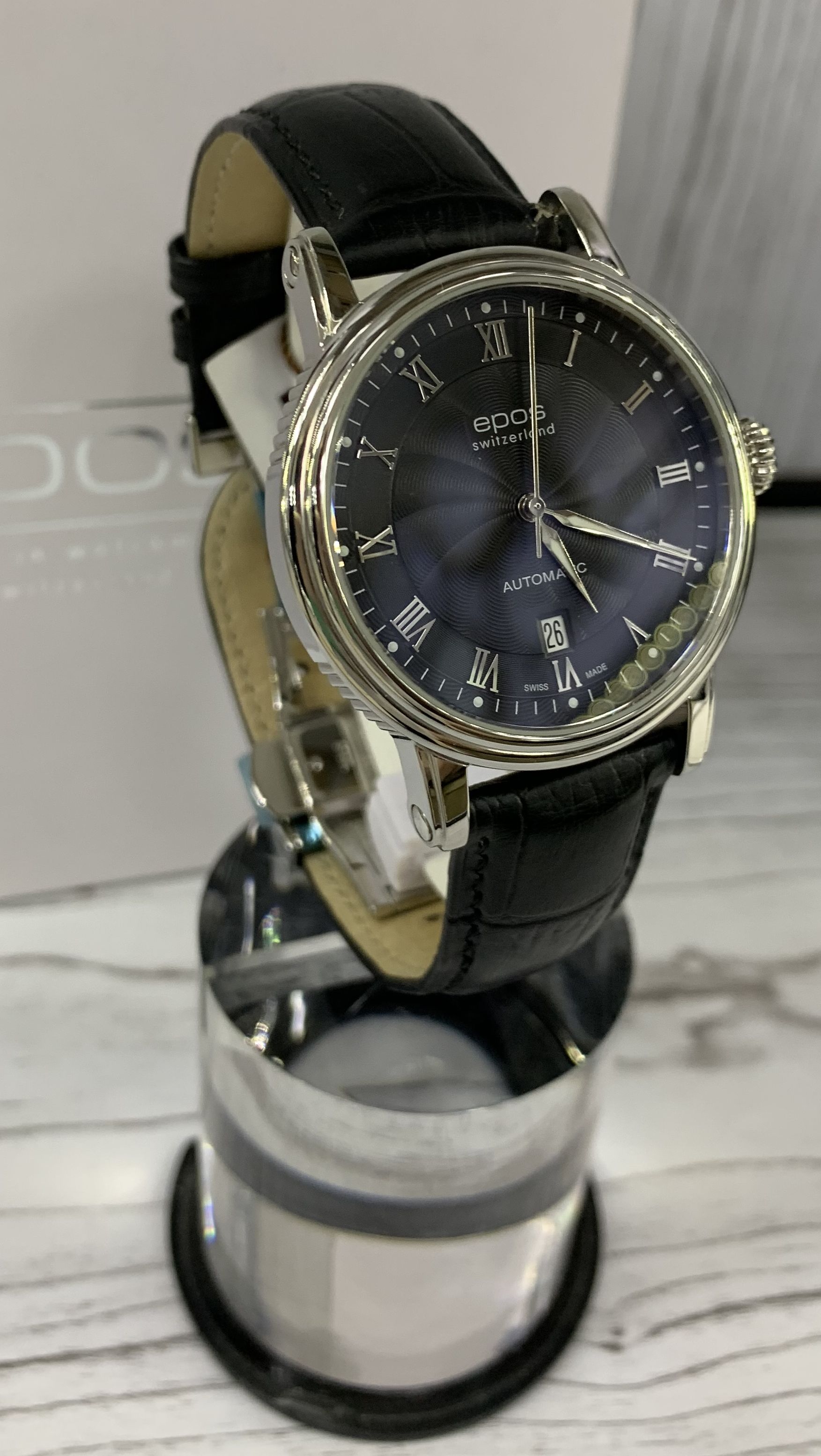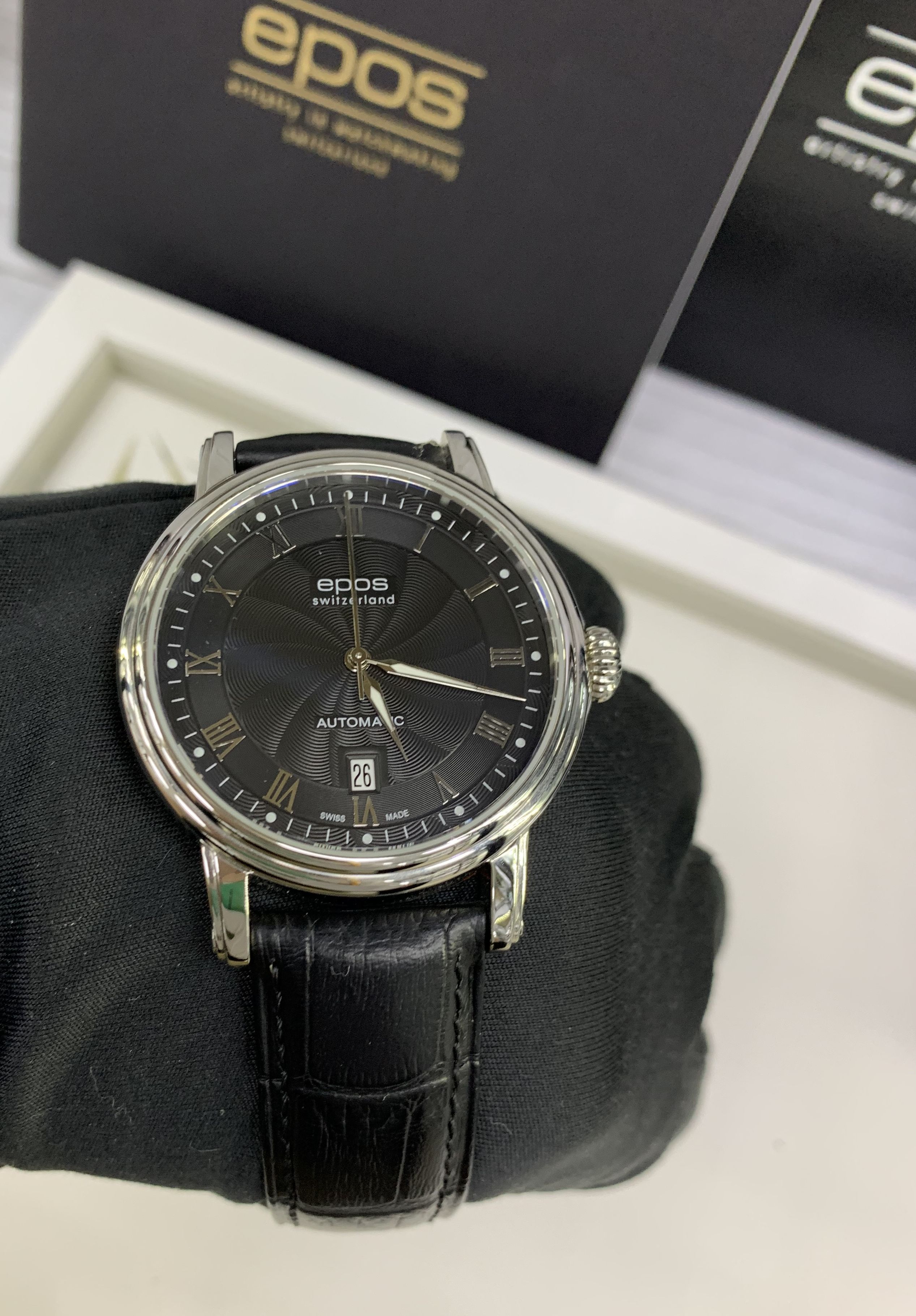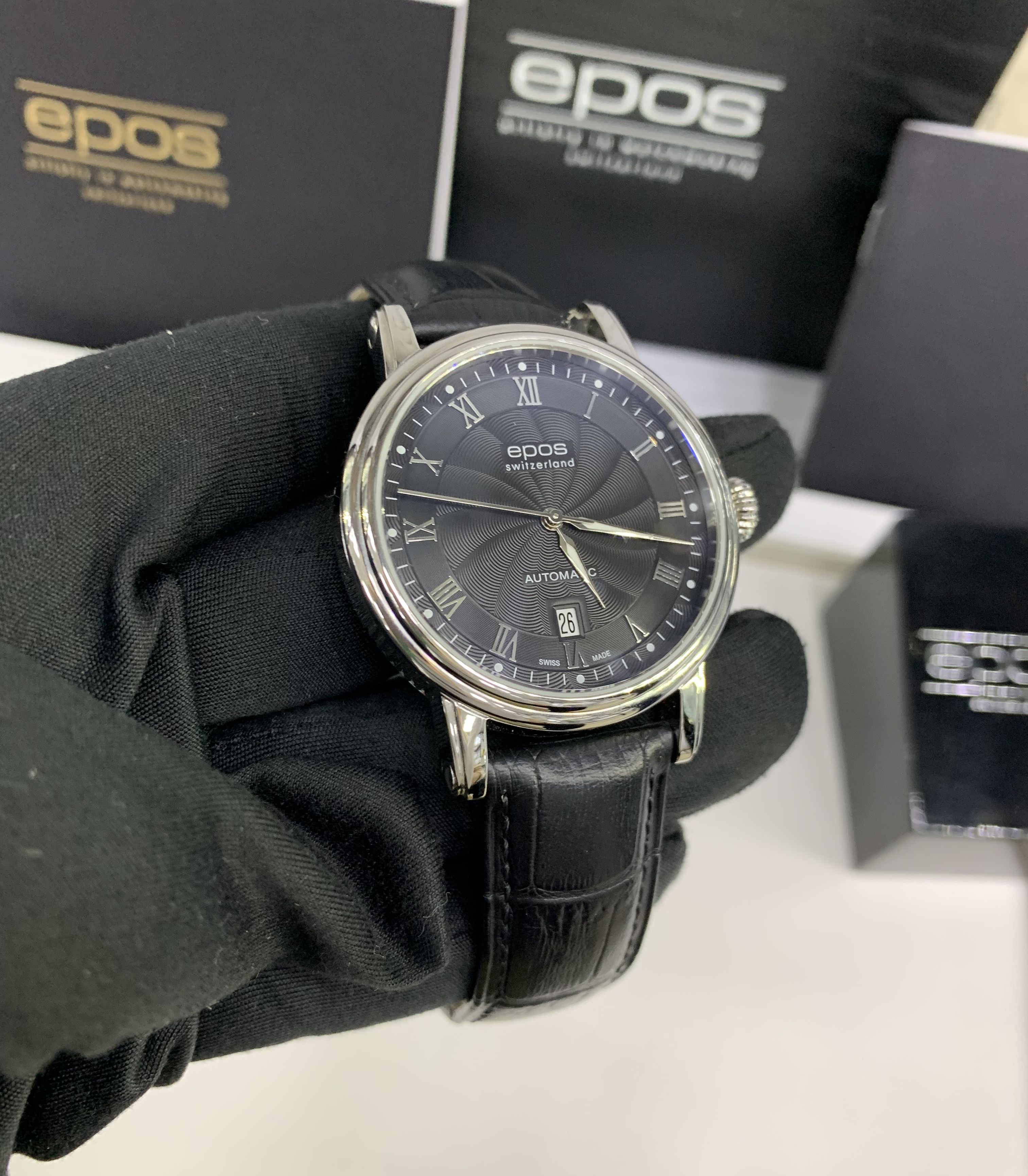 Швейцарские механические мужские наручные часы с автоподзаводом Epos 3390.152.20.25.25 на чёрном ремне из натуральной кожи. Корпус часов выполнен из нержавеющей стали. Циферблат круглой формы, чёрного цвета. Сапфировое стекло по прочности, уступающее только алмазу. Водозащита часов 50 метров. Окно даты.