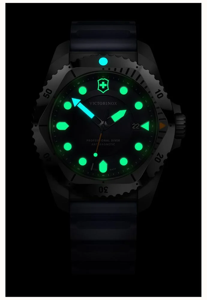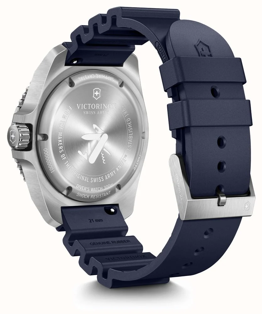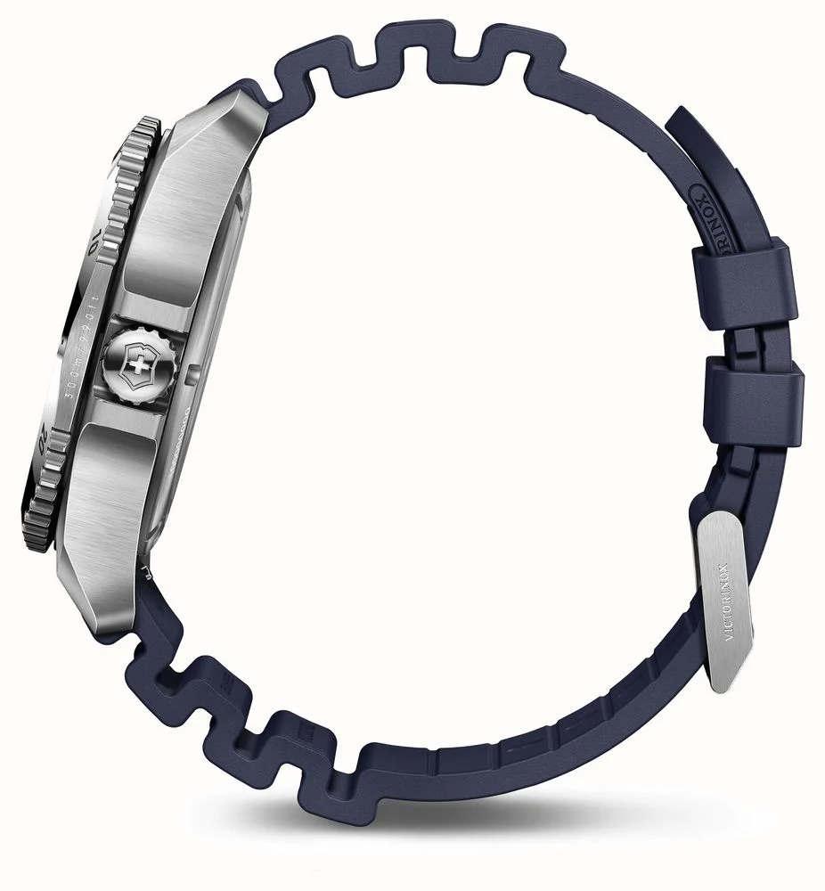 Мужские швейцарские наручные часы Victorinox Swiss Army 241991, хронограф, швейцарский кварцевый механизм Ronda 5030.D, индикация даты. Циферблат синего цвета. Стальной корпус, диаметр 43 мм, вращающийся безель с покрытием из сапфирового стекла, устойчивым к воздействию UV-лучей, накладные цифры, накладные индексы, люминесцентное покрытие на стрелках, сапфировое стекло с тройным антибликовым покрытием, водоустойчивость 300 м.