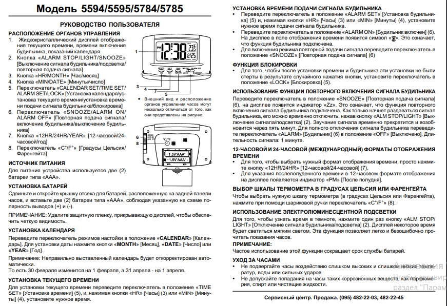 Откройте крышку батарейного отсека на задней стороне будильника и вставьте батарейку типа ”AAA” правильно соблюдая полярность. Установите крышку батарейного отсека на место. Батарейка, поставляемая вместе с будильником, является проверочной и может не обеспечить нормальную работу будильника. Установка календаря: Переведите переключатель в положение Calendar. Кнопками Month, Date и Year установите текущую дату. Невозможная дата будет автоматически исправлена на возможную. Установка часов: Передвиньте переключатель 5 в положение Clock Set и кнопками Hr (часы), Min (минуты) установите текущее время. Установка будильника: 1. Передвиньте переключатель 5 в положение Alarm Set, на дисплее появится значок “Al”. Кнопками Hr (часы), Min (минуты) установите время сигнала. 2. Передвиньте переключатель 6 в положение Alarm On. На дисплее появится значок сигнала. При этом будильник перейдет в состояние готовности. 3. Чтобы активизировать функцию Snooze переведите переключатель 6 в положение Snooze Alarm. Функция Lock. После установки часов и будильника передвиньте переключатель 5 в положение Lock для того чтобы сохранить установки в памяти будильника и помешать случайной переустановке. Использование функции Snooze. 1. Передвиньте переключатель 6 в положение Snooze. При этом на дисплее появится надпись Zz и функция Snooze будет активизирована. 2. Если будильник прозвонит Вы можете выключить сигнал нажав на клавишу Alarm stop/Light (2). Через 5 минут ваш будильник прозвенит вновь автоматически. 3. Чтобы полностью выключить сигнал переведите переключатель 6 в положение Alarm Off. 12/24 часовой режимы. 1. Переключателем 12Hr/24Hr (7) Вы сможете выбрать 12 часовой или 24 часовой формат отображения времени. 2. Значок Pm появляется, чтобы указать на вторую половину дня в 12 часовом режиме. Выбор шкалы измерения температуры. Нажмите кнопку C/F для выбора температурной шкалы. Использования люминесцветной подсветки. Если Вы хотите посмотреть время в темном помещении, просто нажмите на клавишу Alarm stop/Light (2) один раз. Дисплей будет освещен на несколько секунд. Частое использование этой функции уменьшает время жизни вашей батарейки. Избегайте воздействия на ваш будильник высоких температур, воды или ударов. Избегайте попадания на Ваш будильник активных химических (в частности спиртосодержащих) веществ.